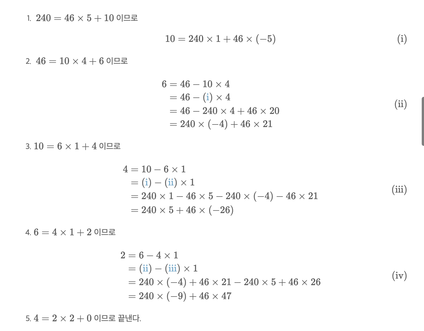ex) $gcd(240, 46) = c$ 라고 할 때 $240x + 16y = c$의 해와 $c$ 구하기